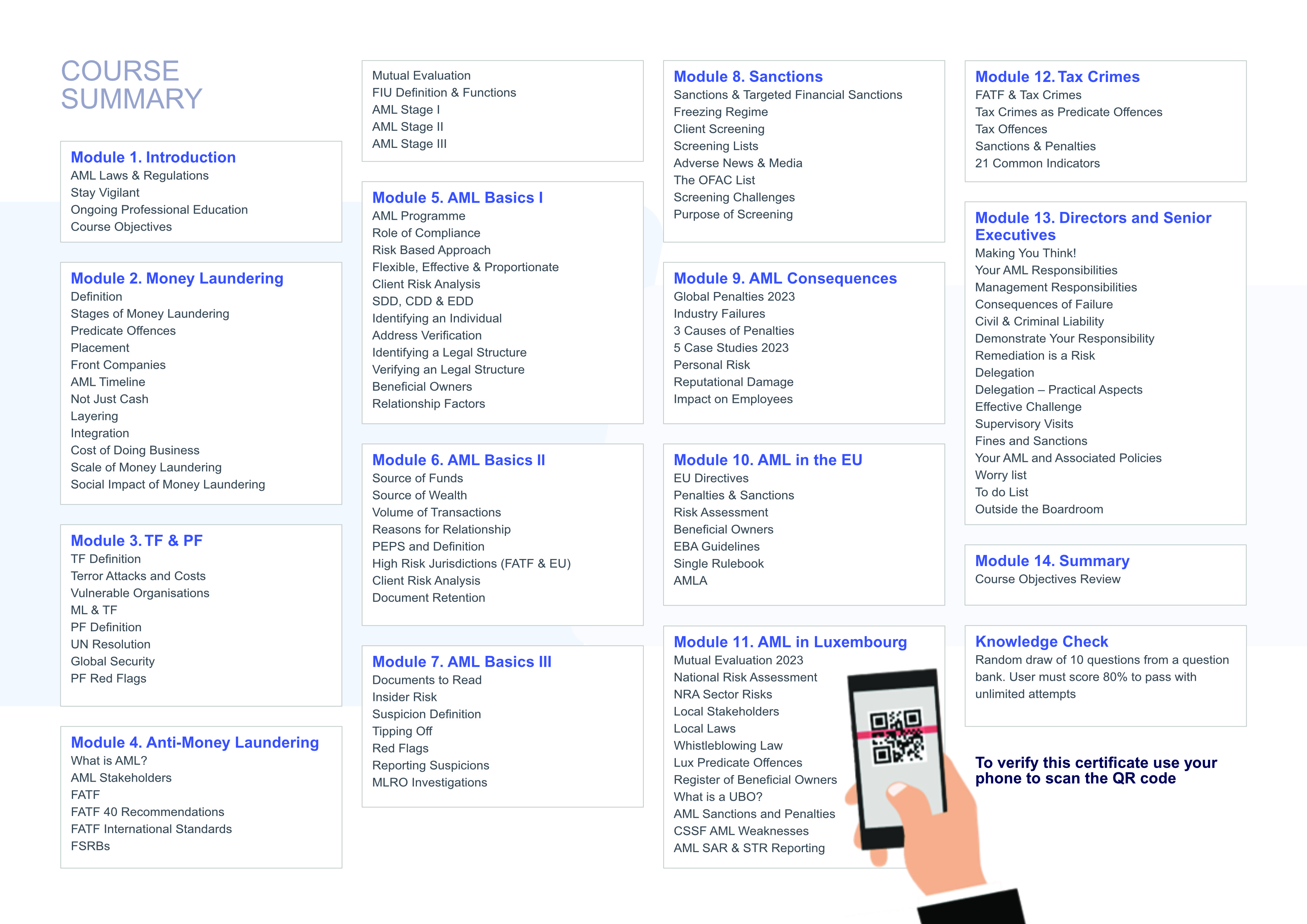 This elearning course covers anti-money laundering, terrorist financing and proliferation financing within Luxembourg laws, regulations and circulars. It is: